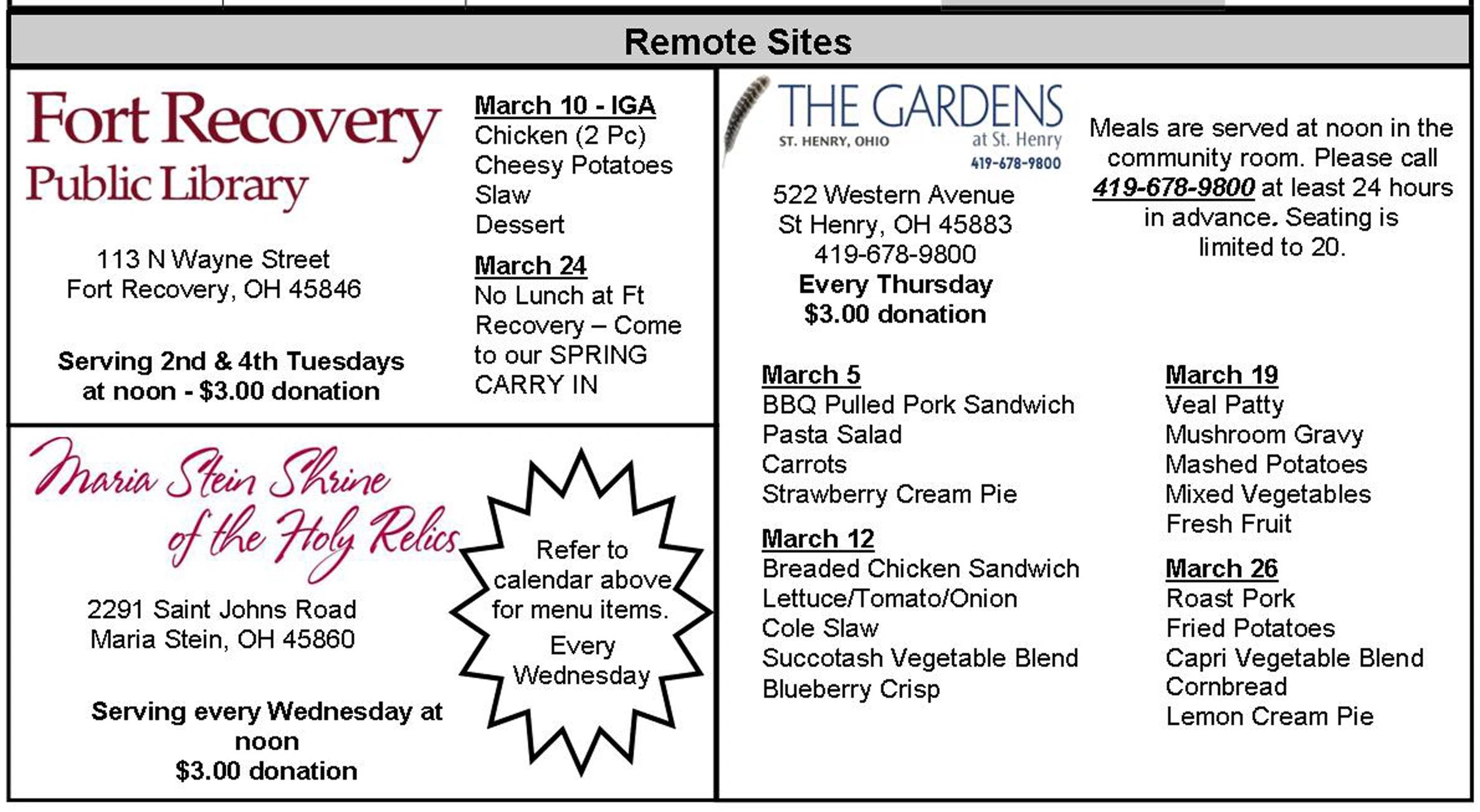 MCCoA, the Ft Recovery Library and IGA work together to provide meals on the second and fourth Tuesday each month. Lunches are served at Noon at the Ft Recovery Library. A donation of $3.00 is collected to cover the cost of the meal. Reservations are required by noon the day before. Call 419-586-1644.
